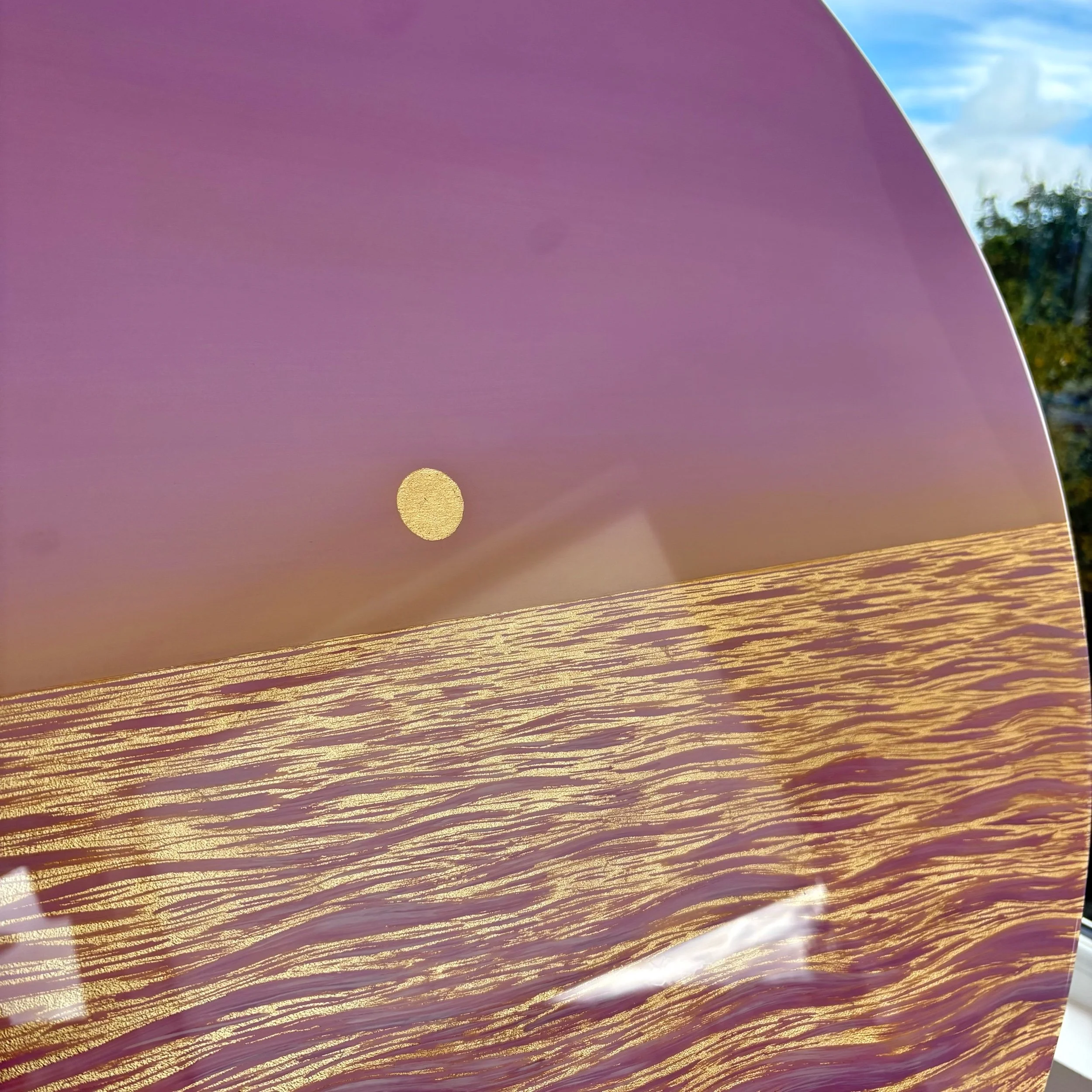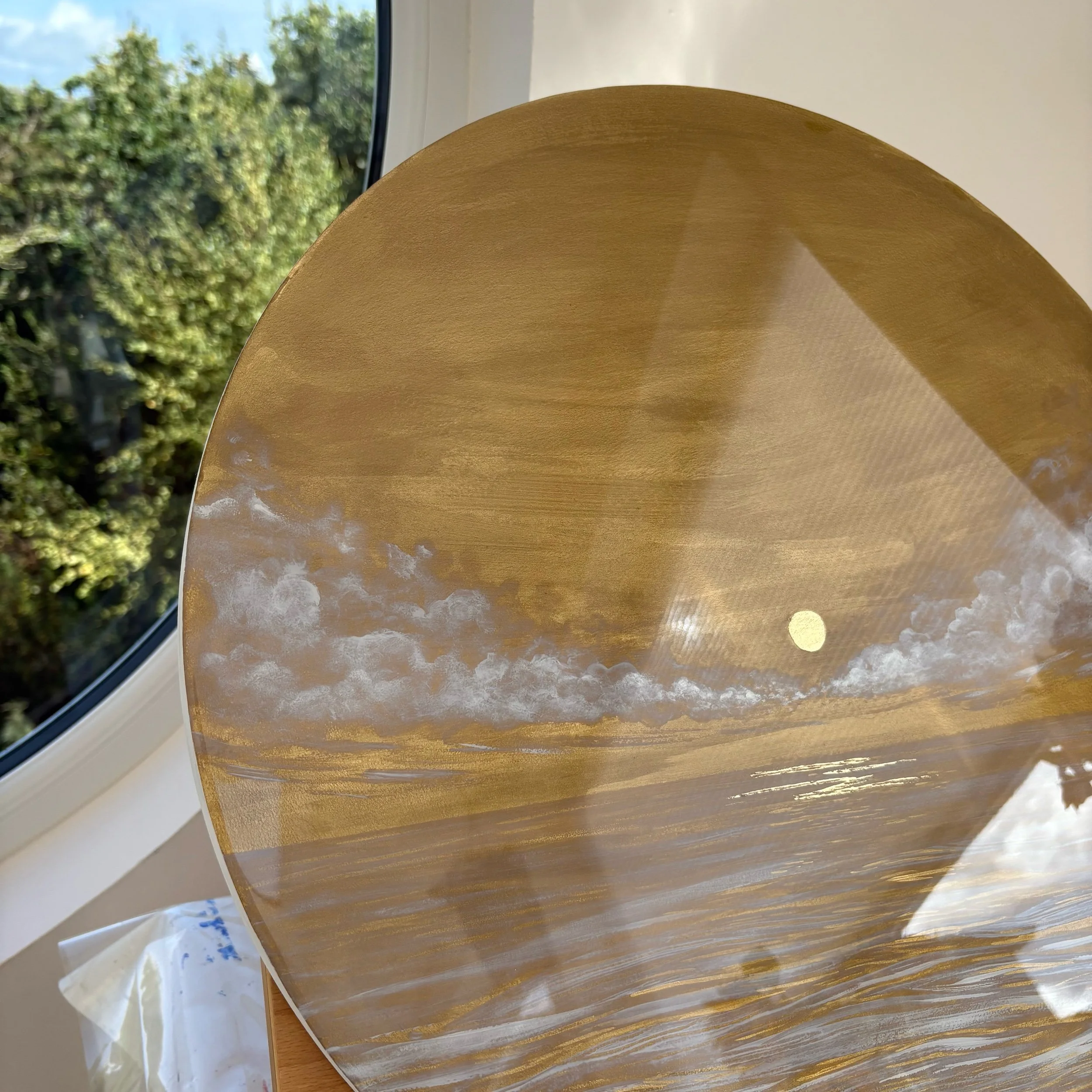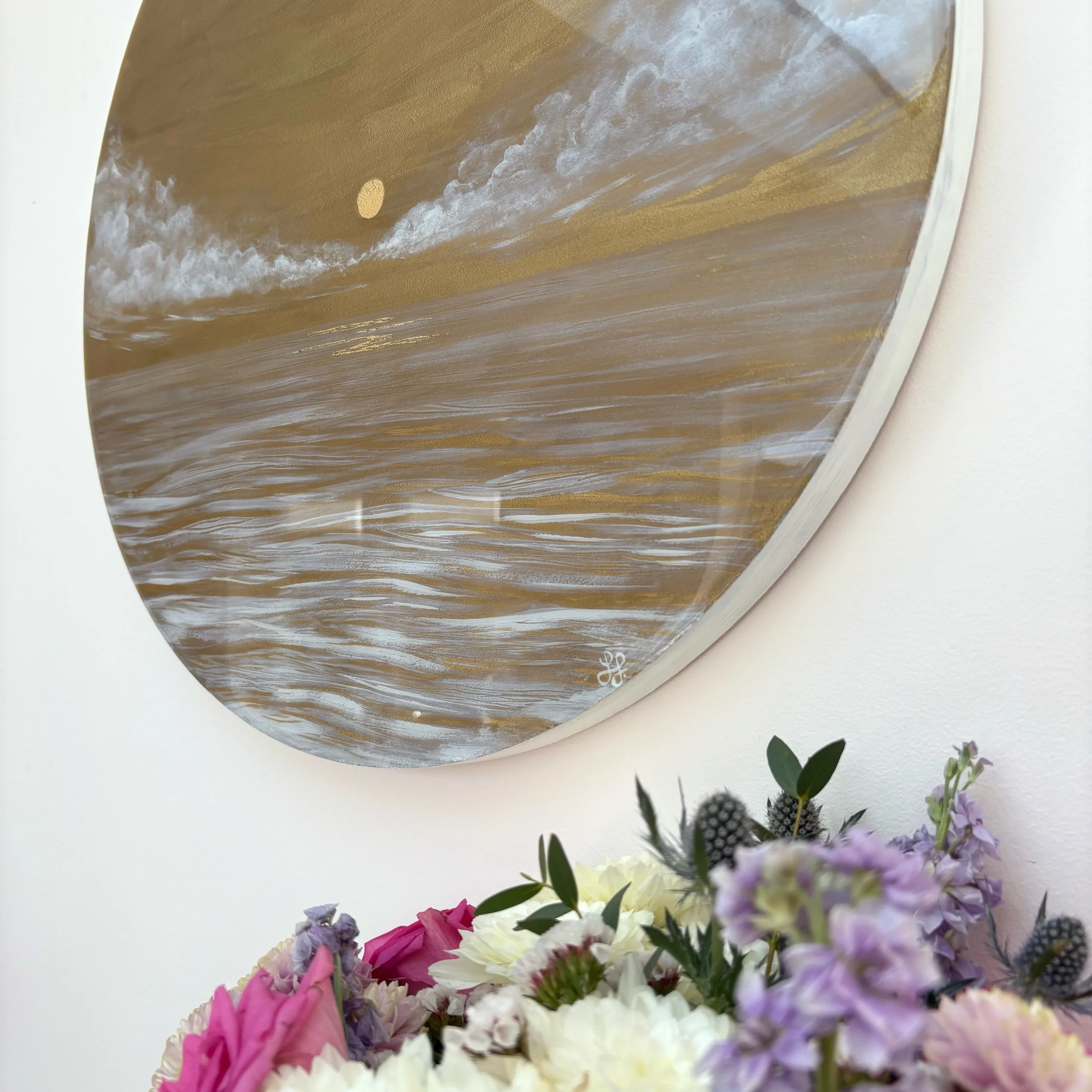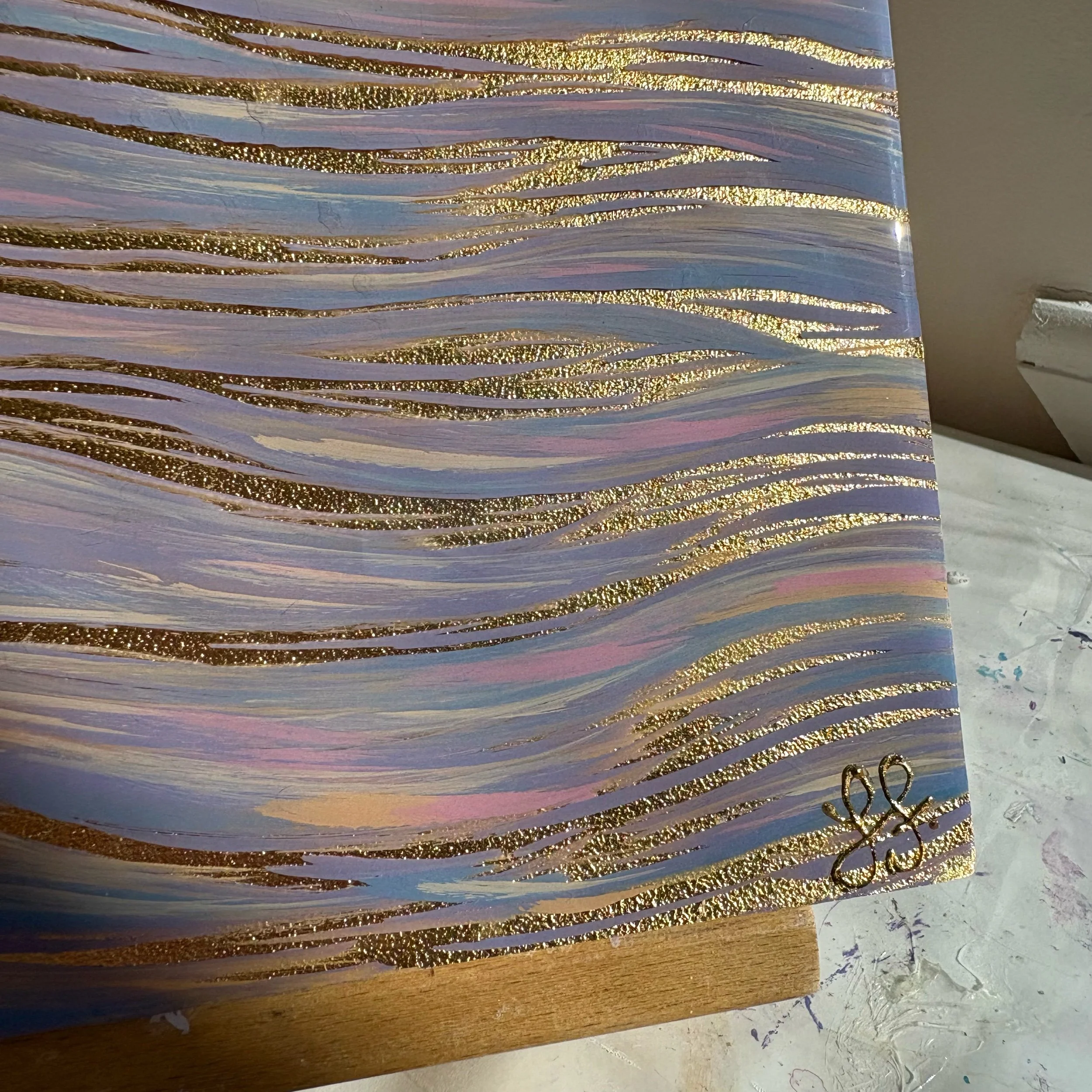 • Created using layers of acrylic paint and faux gold leaf, this piece is finished with a luxurious resin topcoat, providing a smooth, glass-like shine.