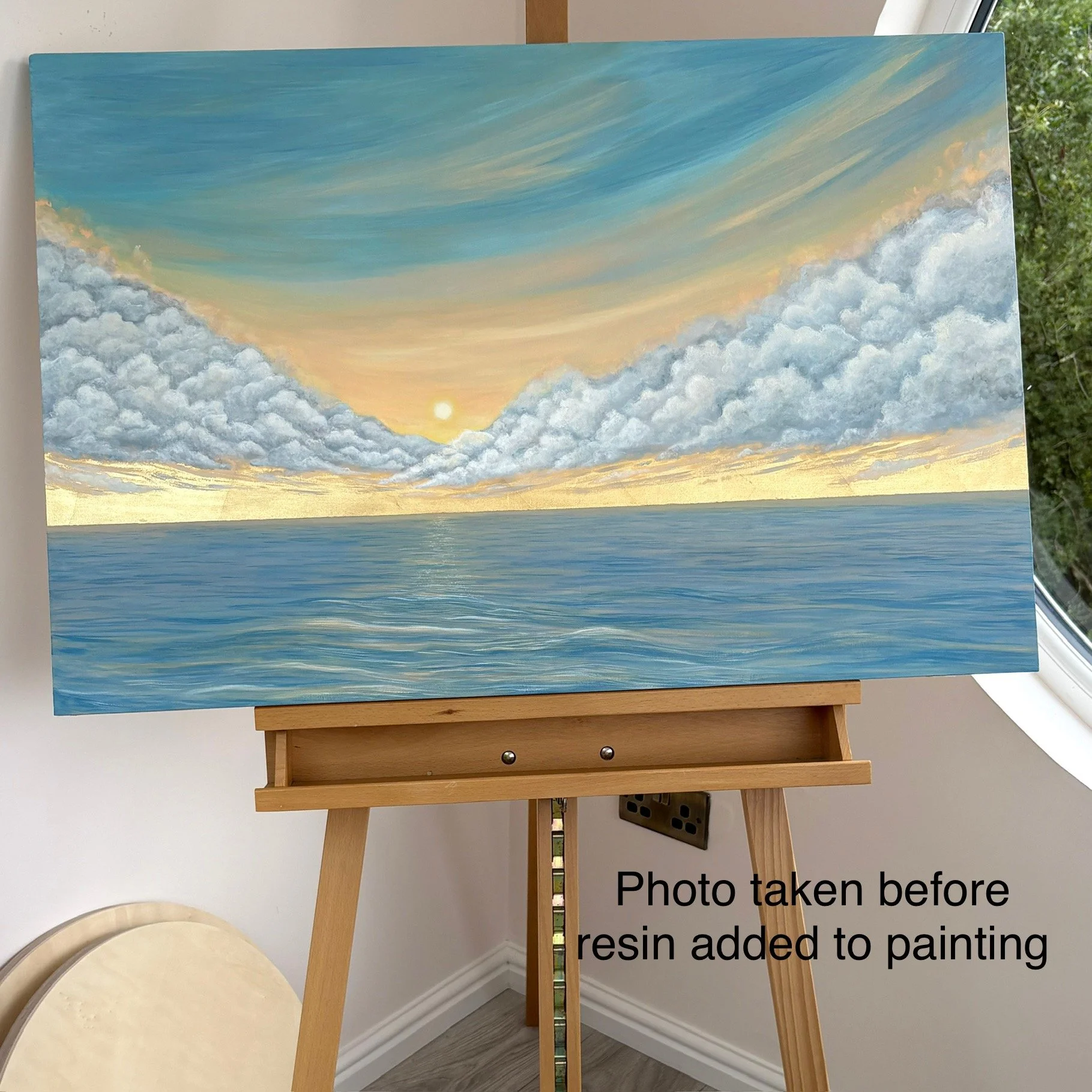 • Created using layers of acrylic paint and faux gold leaf, this piece is finished with a luxurious resin topcoat, providing a smooth, glass-like shine.