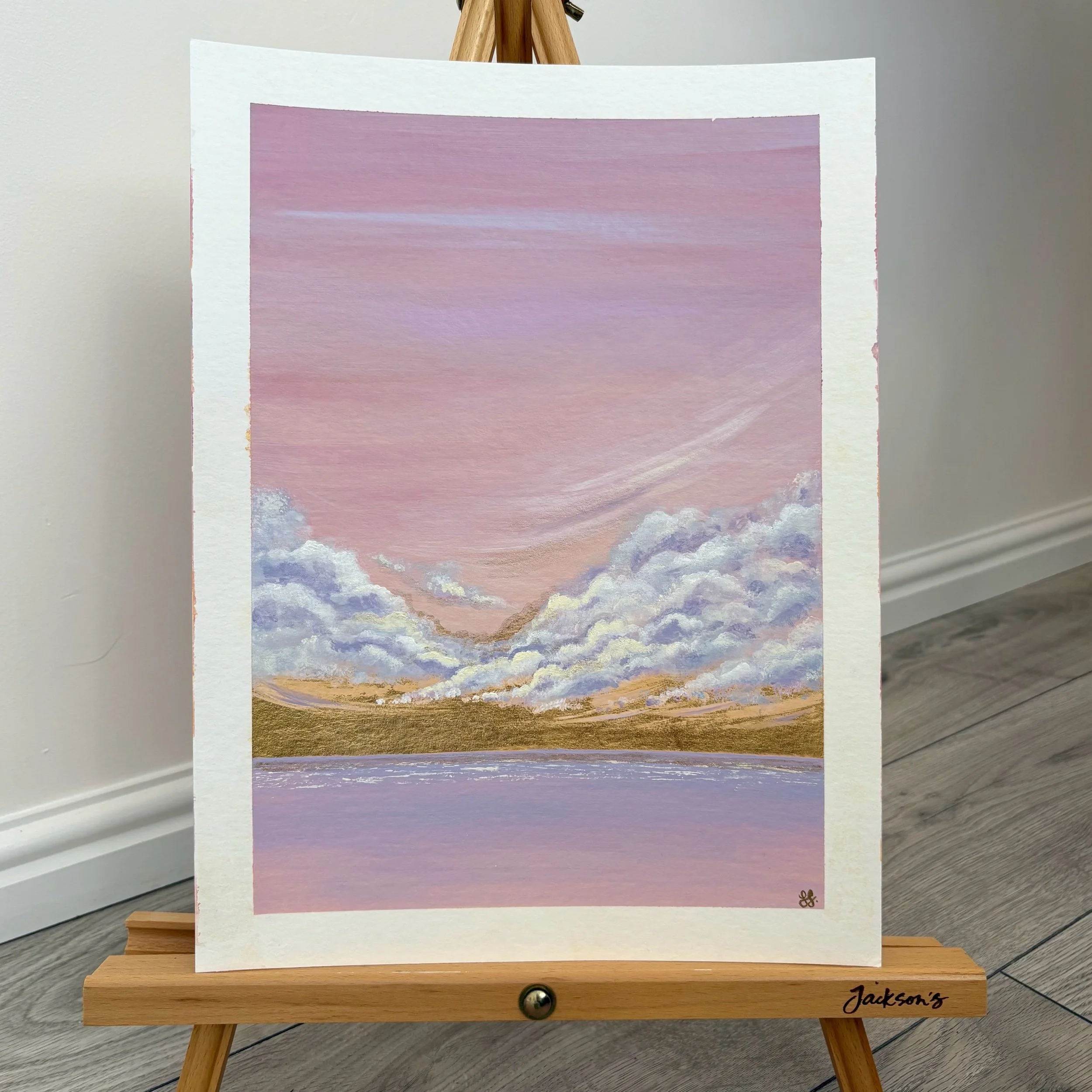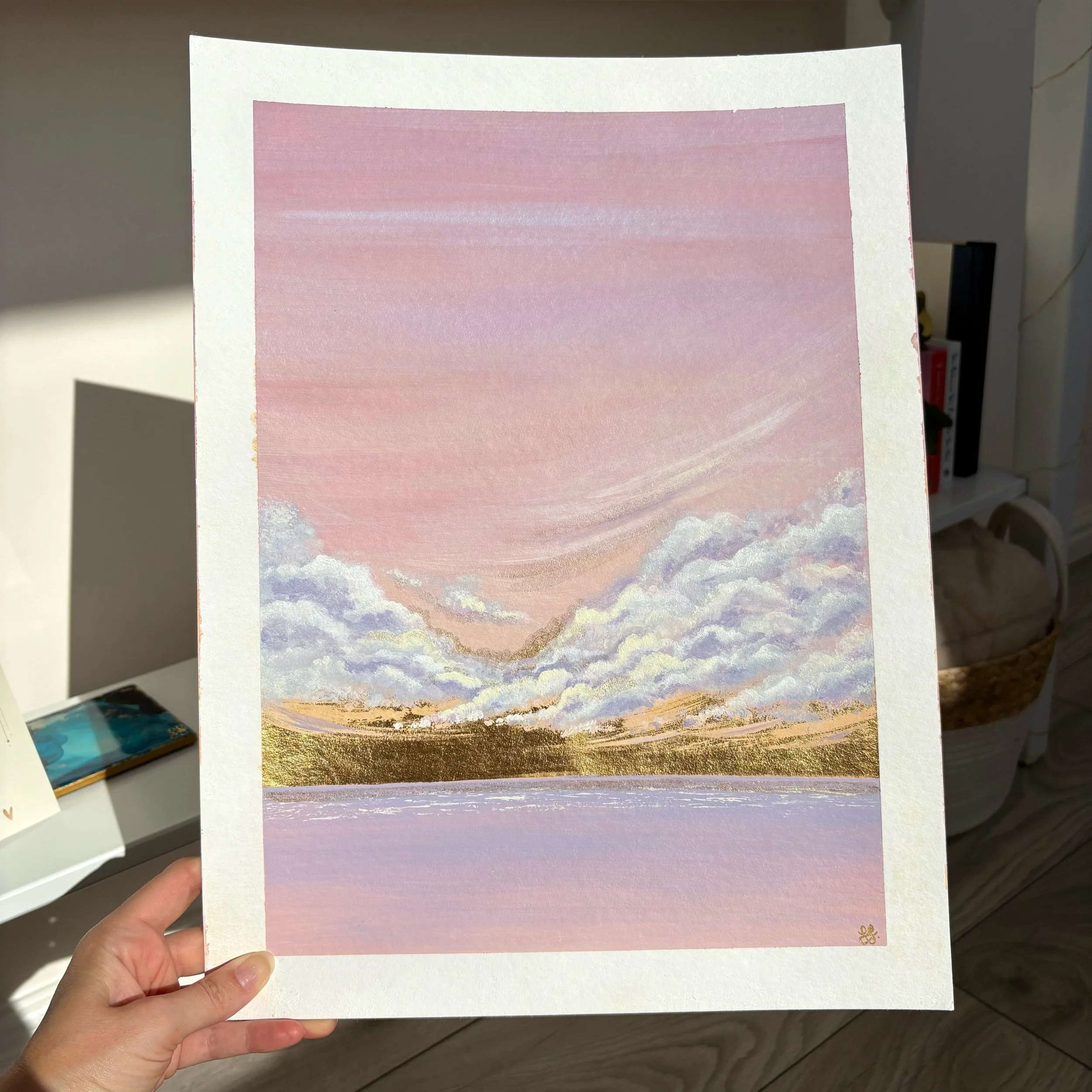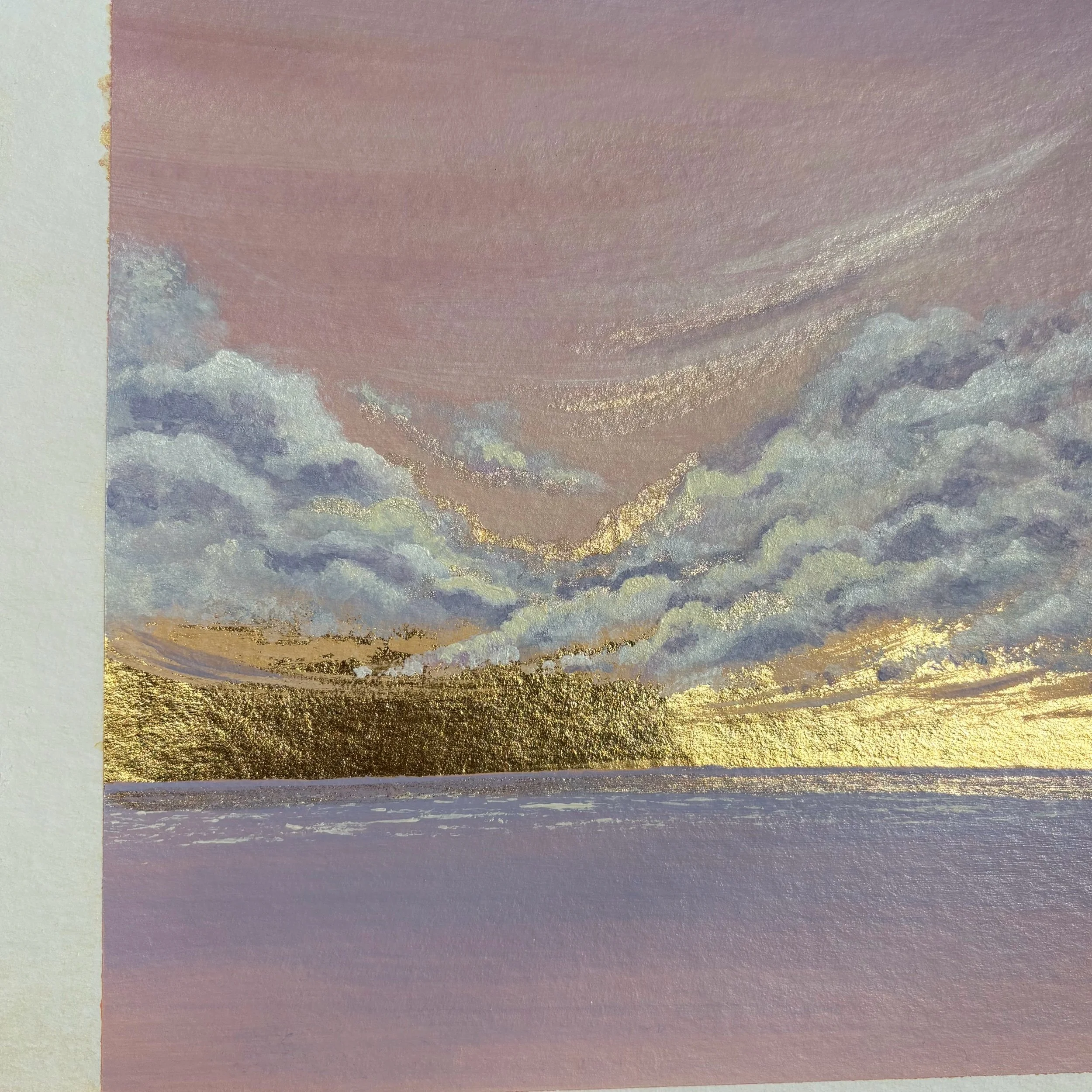 Each piece is enriched with delicate gold metal leaf along the horizon line, catching the light and illuminating those almost-missed moments when the ordinary transforms into something extraordinary.